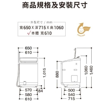 • 12KG 變頻直立洗脫烘洗衣機
